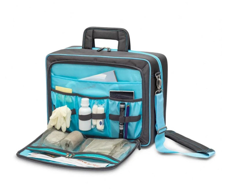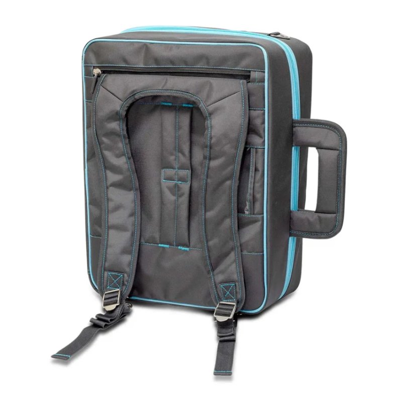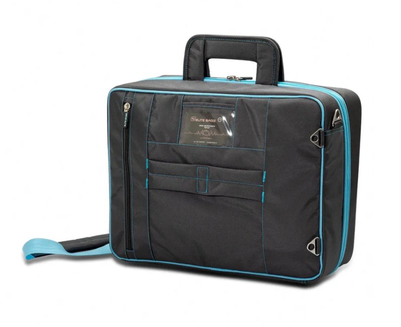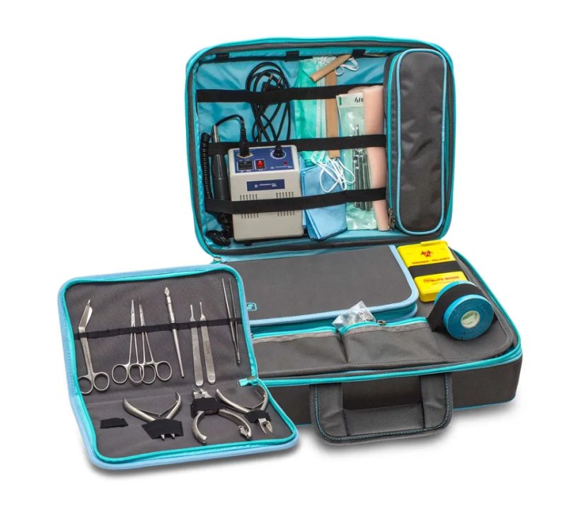 Große, multifunktionelle Tasche welche insbesondere gemäß den Anforderungen von Zahnärzten und Fußpflegern bei Hausbesuchen entwickelt wurde. Die Tasche hat ein Spezialfach für die sichere Lagerung des Steuergeräts sowie weitere Fächer für die entsprechenden Komponenten und Werkzeuge.