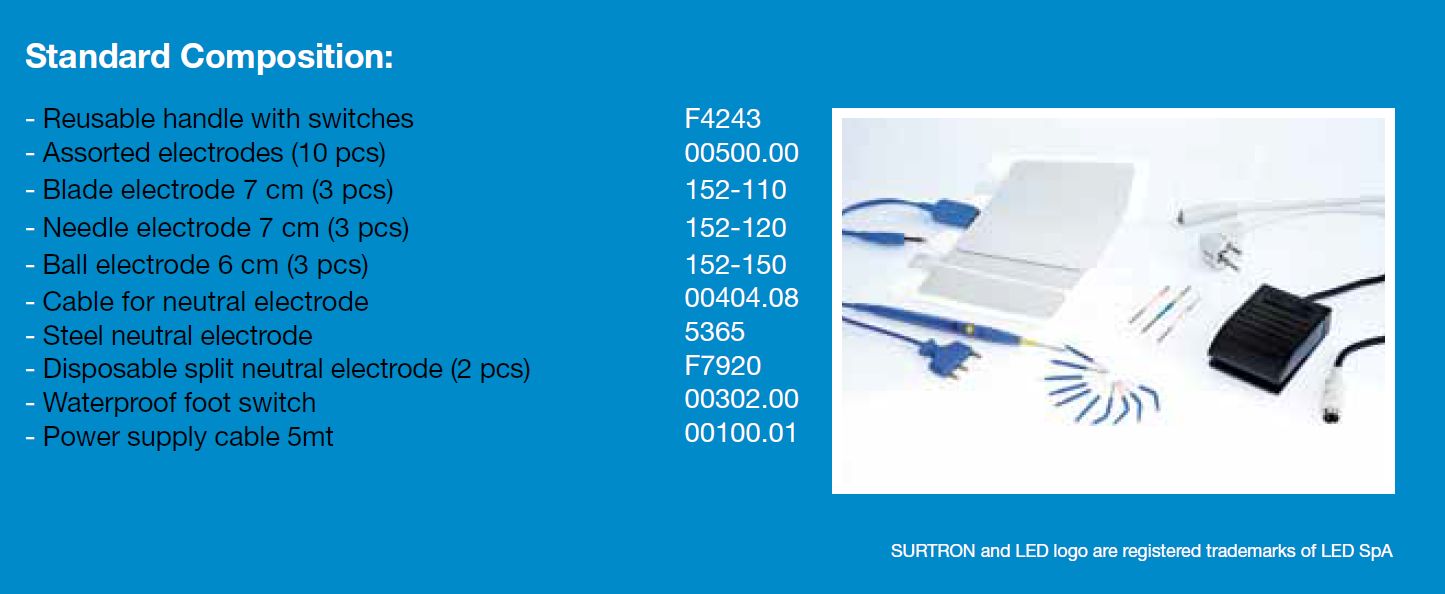 Durch seine Leistungen ermöglicht Surtron 200 einen reinen Schnitt, eine Schnitt-Koagulations-Mischung, eine Inzision mit reduzierter Schorfbildung, eine oberflächliche Koagulation mit forcierter Koagulation, eine tiefe Koagulation ohne Nekrose mit weicher Koagulation und eine bipolare Koagulation.