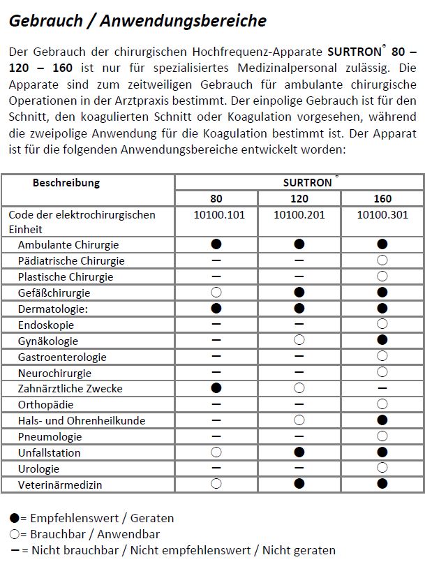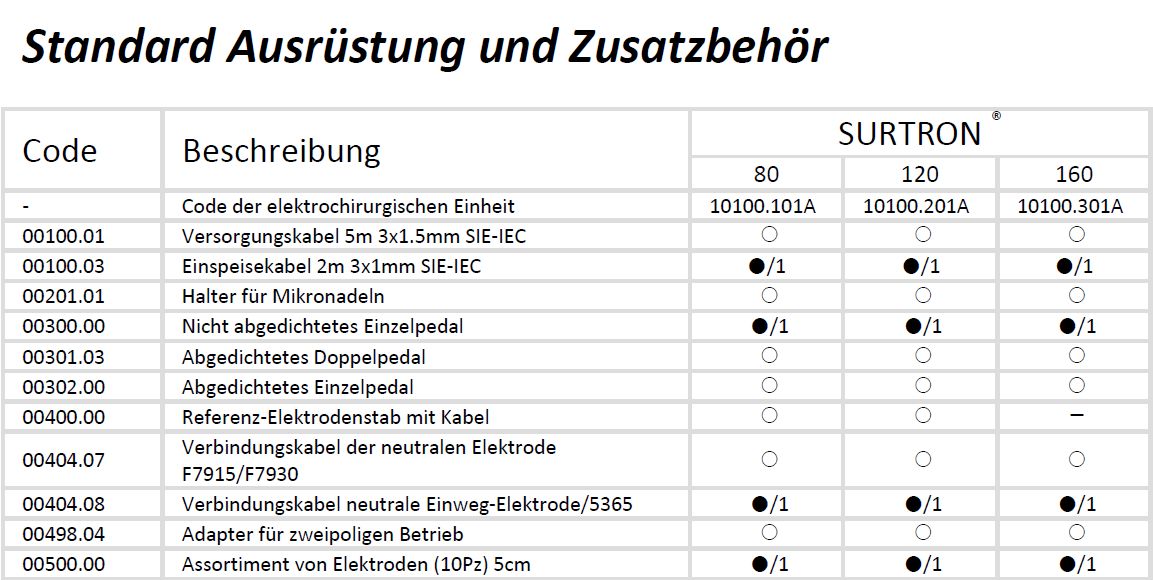 SURTRON 80/120/160 ermöglicht durch seine Leistung den reinen Schnitt, die Schnitt-Koagulation BLEND, die oberflächliche Koagulation forced coag, die tiefe Koagulation in Abwesenheit von Nekrose soft coag und, mit einem speziellen Adapter, die bipolare Koagulation.