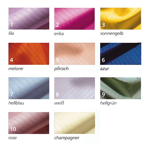 Vorhang aus Trevira CS, schwer entflammbar. Reinigung bei bis zu 60°C-Wäsche mit Desinfektionsmitteln. Farben (bitte bei Bestellung angeben): lila, champagner, sonnengelb, melone, pfirsich, azur, hellblau, weiß, hellgrün, grau.