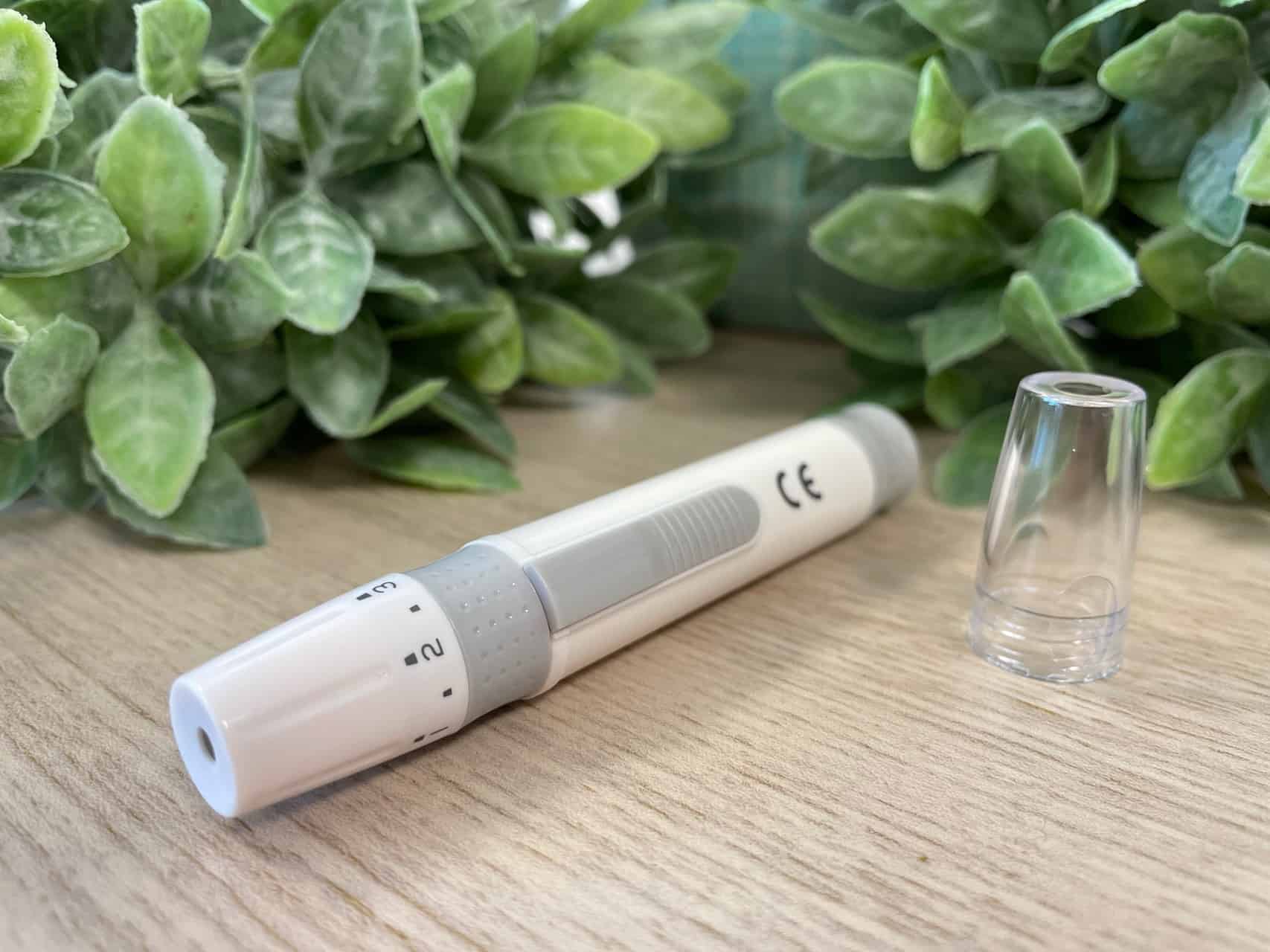 - Automatischer Auswurfknopf zum Entfernen der gebrauchten Lanzette aus dem Stift